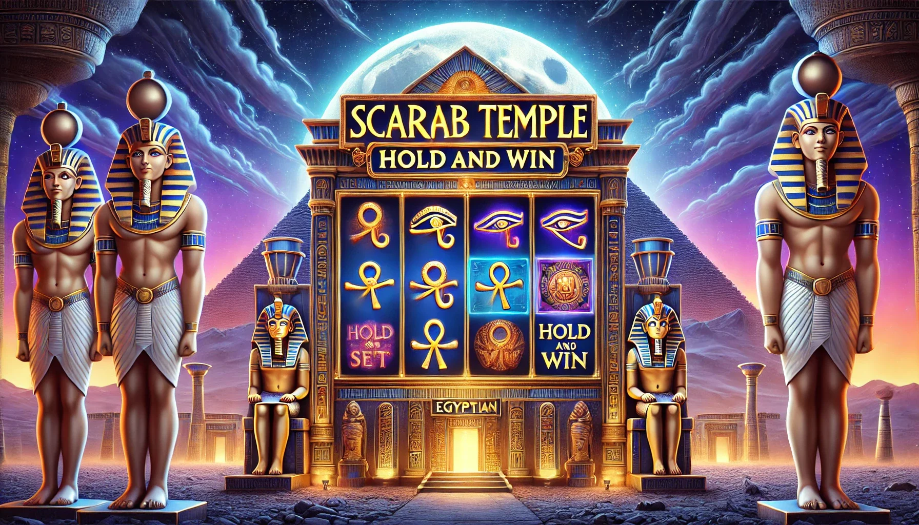 Scarab Temple: Hold and Win — як видеослоти классикӣ, аммо бо иловаи функсияҳои муосир, ба монанди фриеспинҳо, рамзҳои WILD ва бозияҳои бонус. Мавзӯи Мисри Қадим тавассути рамзҳои маскаҳои фиръавн, рамзҳои худоӣ ва иероглифҳо зинда мешавад, муҳити сирр ва саҳрабозиҳоро эҷод мекунад.